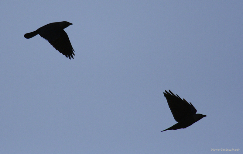 Instantes del batido de alas de dos grajillas (Corvus monedula), con subexposición para mostrar únicamente la silueta del ave.