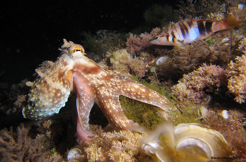 Me resulta curiosa la relación que mantiene estas dos especies, que aparecen en esta foto mirándose cara a cara. Recorte aprox. 15%. Realizada en apnea con Canon S95 + Carcasa Canon WP-DC38+ Pletina y brazo articulado SAGA + Flash INON S2000.