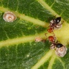 Una chinche utiliza su aparato bucal picador chupador a modo de jeringuilla para subcionar los fluidos de una planta.